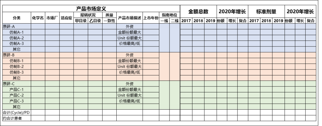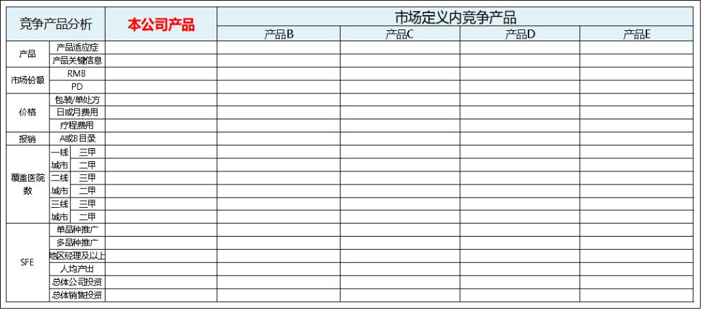 在这张表填写完成后,希望诸位产品经理们,能够看挖掘到——在定义产品范围内咱们的产品比较竞争产品的适应症、商业份额、价格、产品覆盖的广度和深度上各又那些维度的优劣势。