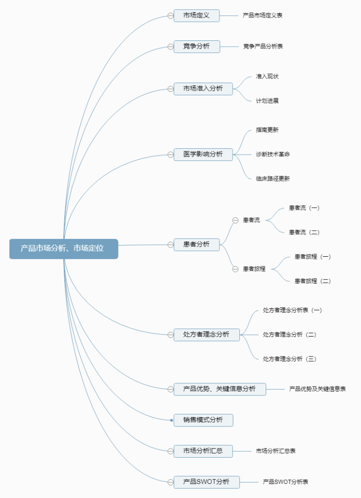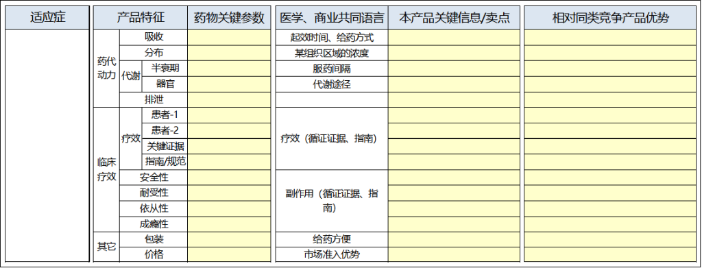 在填写这张表的时候,我们从之前的一系列竞品、环境、患者、医生等分析中提炼出的我产品在目前的市场定义里核心优势就出来了,具体表现为临床数据、指南或治疗规范中的地位的优势、安全性的优势、方便使用的优势、价格的优势、产品服务的优势、甚至的产品配套的优势等。