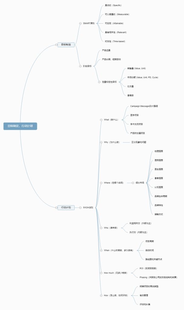 目标制定、行动计划:分为两步,第一步是遵循SMART原则设定目标, 第二步是遵循5W2H法则,针对目标制定行动计划。