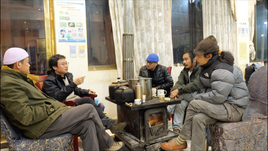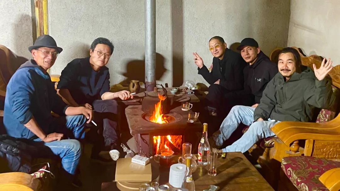 一部分人抵达丽江,我们取到了在此租的三台越野车,随后去朋友和文朝(左一)家里烤火,他关注在地性的艺术实践,同时也是个在地的老手,他疑惑我为什么要来怒江。怒江对于我来说不像是人类学或者社会学那种对地点的必要性,单纯只是在我2017年做完横断山最东边的走岷江项目后,对横断山最西边怒江的想象和兴趣,比如山河的结构、形态、样貌、空间和这里的人,对于“行走策展”的长期实践使我不仅仅执着于展览只是一个实体的尝试,转而专注于和艺术家共同面对艺术的生发过程,比如与时间、地点相关的概念:过程、短暂、场所、景观等,不同的地点可以说成是艺术项目的媒介和工作场所,艺术也更多的是自然生发出的原始情感的具象化,而非技术的堆砌。