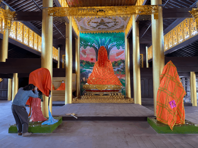 菩提寺正在翻新,建筑风格融合了傣族干栏式和汉族的歇山式,正殿供奉释迦摩尼像,下方的两个菩萨,左边是善恶之神威士众,右边是土地之神南娃宋特妮,这个组合不多见,或许是外来宗教在经过长时间的磨合后,融汇了当地的本土文化,并从中自取所需的内容,这不仅仅是自身的变化,也使得本土文化发生了重新组合的现象。