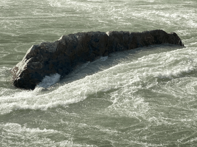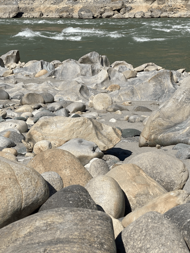 怒江在此处弯出一个弧形,旱季露在江岸的石头像浪花的化石,和江面对比起来就是怒江的正负面吧,石如江底水流的姿势,石浪头,朝下游。