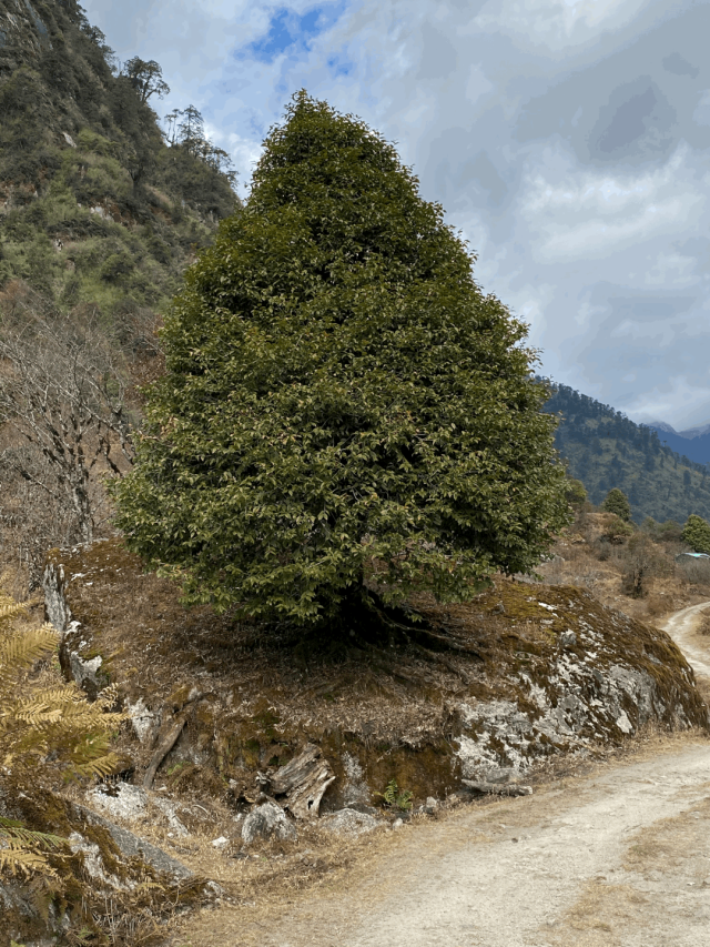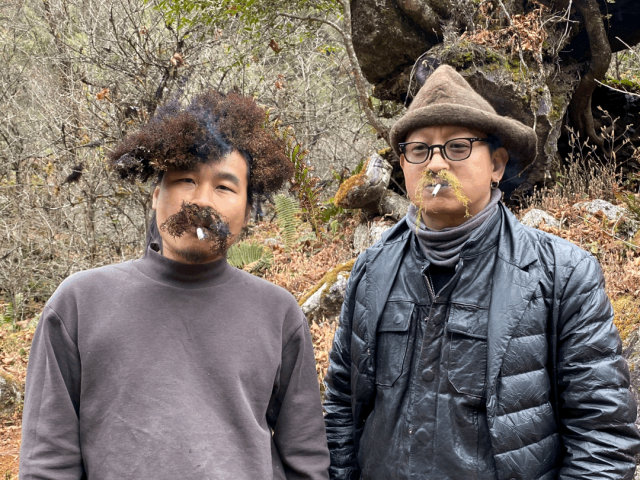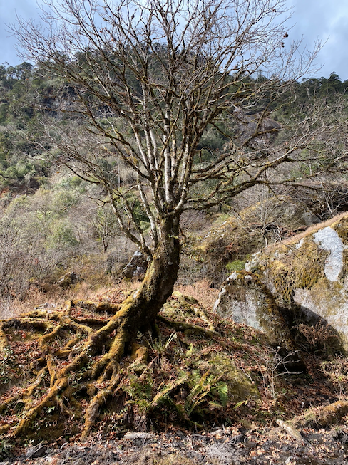 野牛谷地势险要,一条盘山窄路不断抬高,到达3000海拔的时候开始在碎石路上进入峡谷深处,植被变得低矮萧条,大树横在河边,一些中不溜的树盘在岩石上,因为营养不良长的奇形怪状,各有各的造型,魔幻怪诞。山峰冷厉,像把尖刀冲天刺去,冷光闪动。远处雪山藏在灰蒙蒙的云中,冷风从那里顺谷刮过,山气肃杀,枯枝败叶,我们拿出白酒喝起,看着两位行为艺术家变成树精。