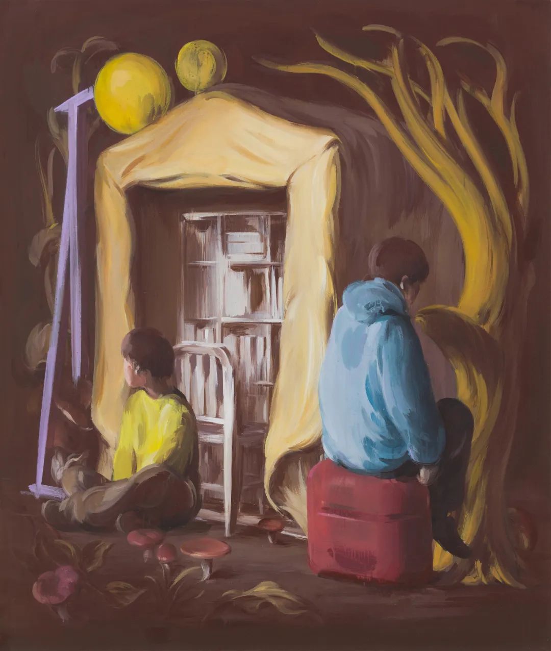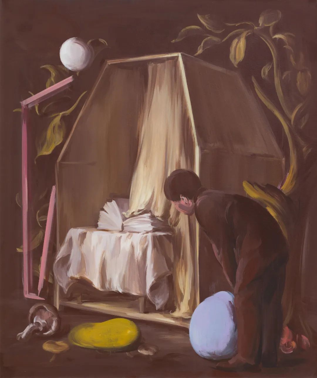 各种简易的建筑构筑物,以木制箱体、布料帷帐等样式,铺有白色衬布的书桌或是餐桌的形象开始出现,独自展开褶皱的布纹,箱体、桌椅、书橱、床榻、衣柜,逐渐表现为相关物象的容纳,搭建出可供栖息与休憩的场所,亦如书房、卧室、餐厅、储藏室等。各种日常物体与自然物象,错落堆叠其间,在想象与重组之中,类似的景物和静物不断演绎为介于不同属性的空间,这些明室与暗房,带有某种虚妄和不真实,似乎被遗弃在野外,整个场景亦像遗址一般等待他者的发现。在静谧幽邃之中,画面一旁伫立或是等待的人,其形象呈现难以描述的状态,带有平静与沉思,像是迟疑或是入定的发现者,似用一种观看的方式,凝视着画面中那一座座临时的居所,似乎等待这些屋舍的主人归来,犹如在等待“戈多”,一场无尽期的守候。