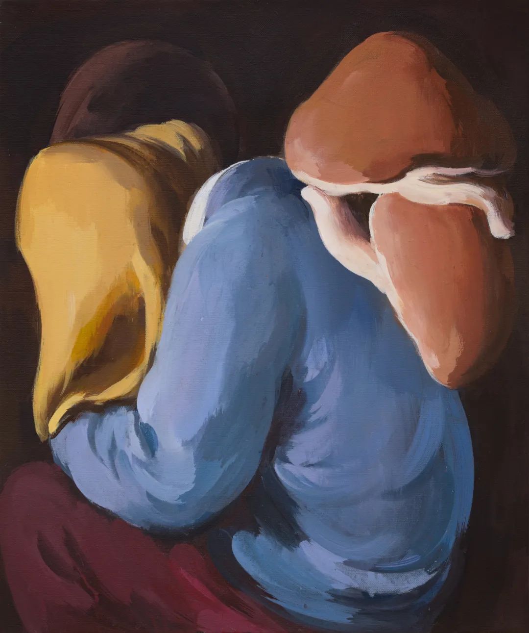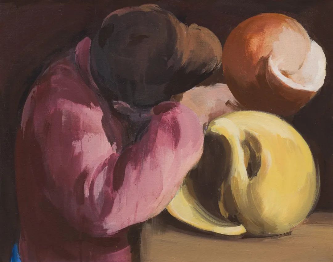 人的形象开始出现,从小幅,多为年轻人,局部半身,选取背面或侧身,带有隐晦和遮掩的体态,卷曲的身体,褶皱的衣纹,不明朗的面容,隐去的身份,伴随着带有联想性的自然物,画中人好似在观察、探究这些尺度夸张的自然之物,并将自身依托、寄居于其间,似与其共存与生活,互相纠缠粘连的无意义状态,带着某种荒诞。