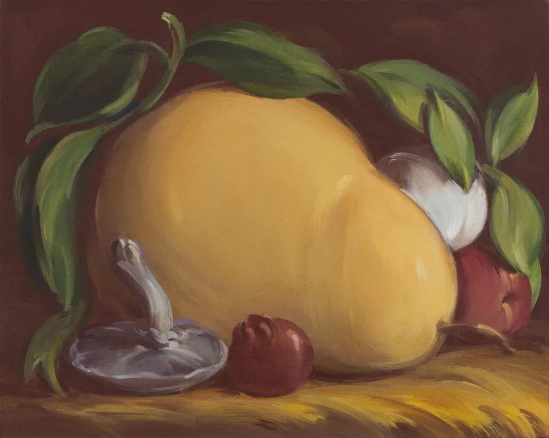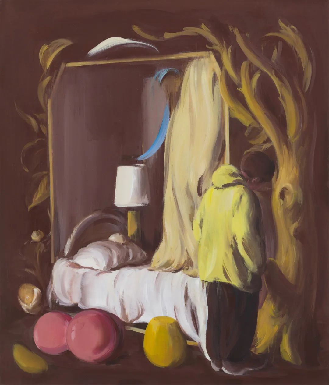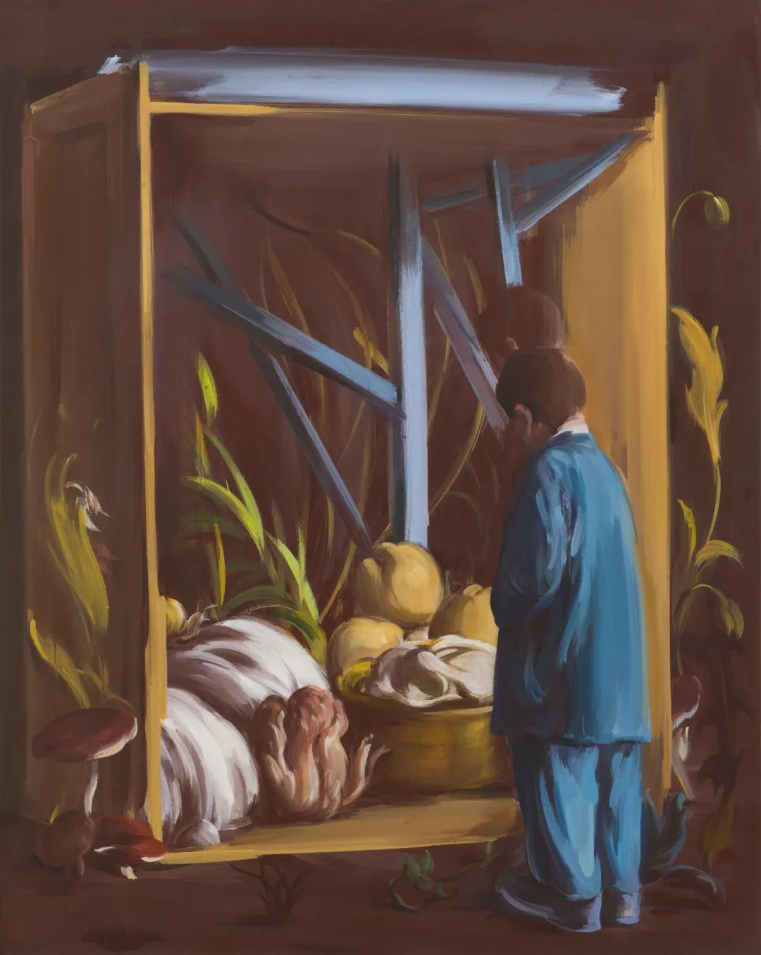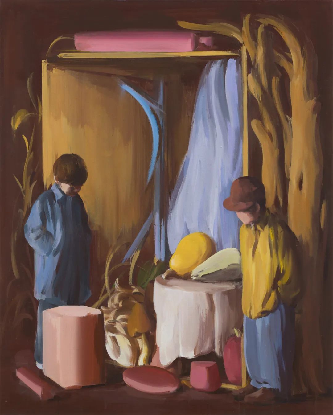 古典化的静物形象成为一种绘画框架,类似荷兰黄金时期绘画,容纳具体的日常物与自然物象,而难以名状的扁平、简化的物象也不断涌现于画面,似乎是静物形象的视觉衍生,它们以各自的造型来源相互重叠、关联,彼此同构,形成某种复合性的绘画景象。而画面内的各种景物,以奇特的比例将现实的具体描绘抽离出来,以某种静物绘画的最终形态,“寄居”于想象中的画面场景之内。