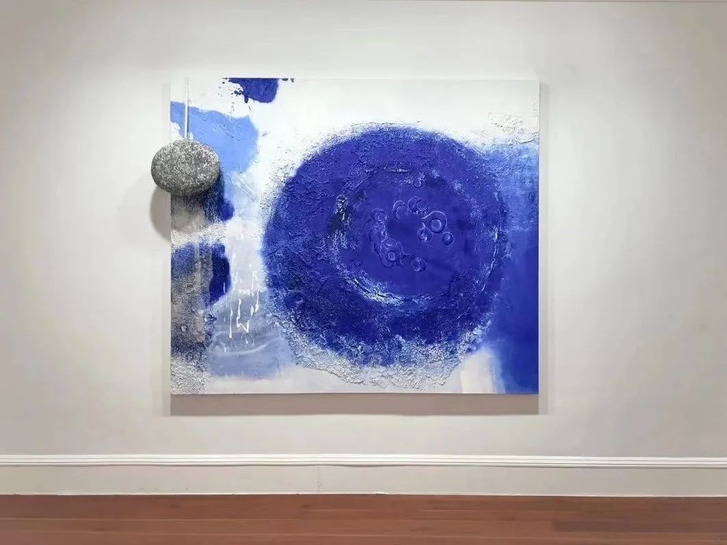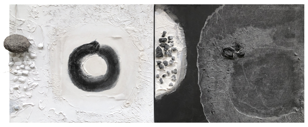 张健君:对,是这样。所以在1982年的时候,我就创作了《永恒的对话》,用了自然物质,在没有先例的情况下用了石、沙 ,在画布上制作成了一个很原始的、永固的、远古的痕迹。然后我用油画颜料画了两个符号,很多人说是太阳或是月亮,有些人说阴和阳,其实它是一个整体的宇宙观,恰恰我觉得这也是一个非常东方的思维方式。