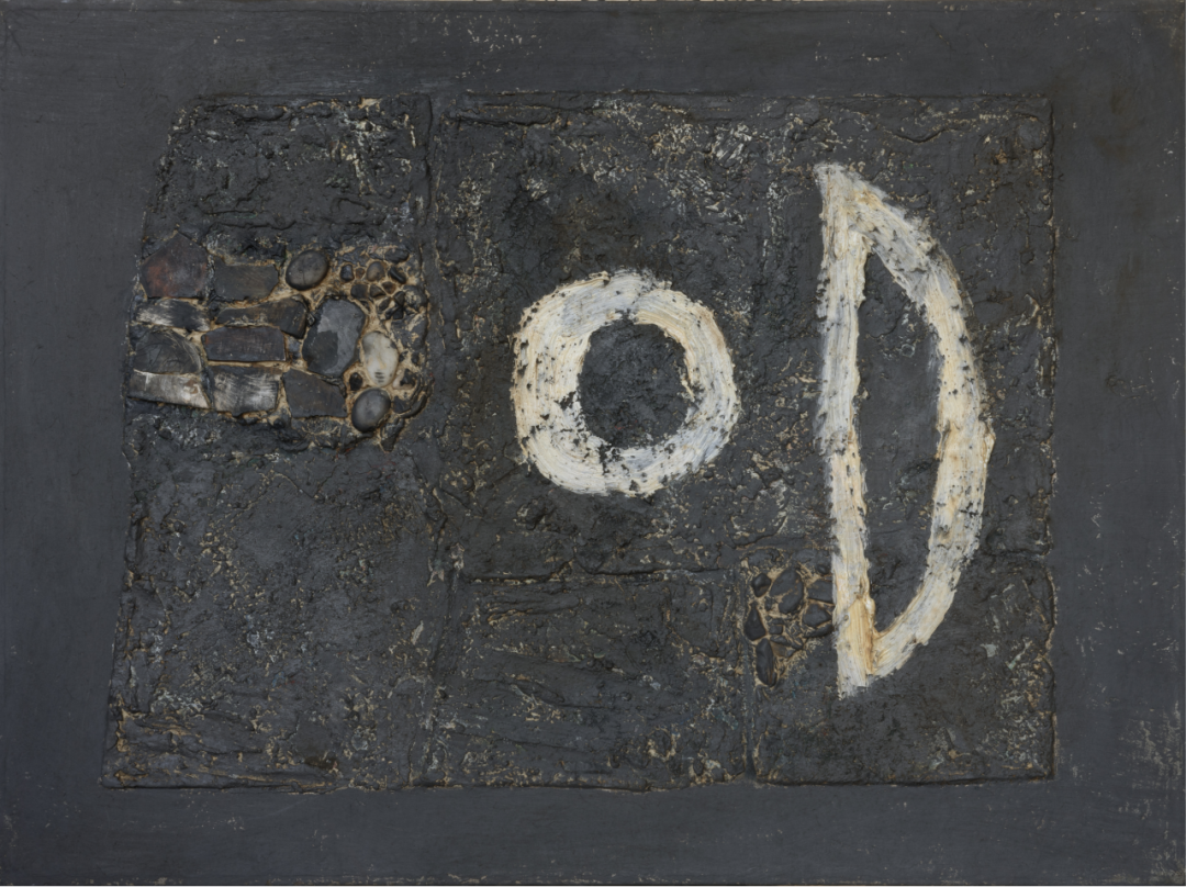 Acrylic, ink, stone, sand, paper, papier mache on canvas