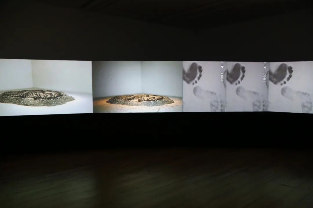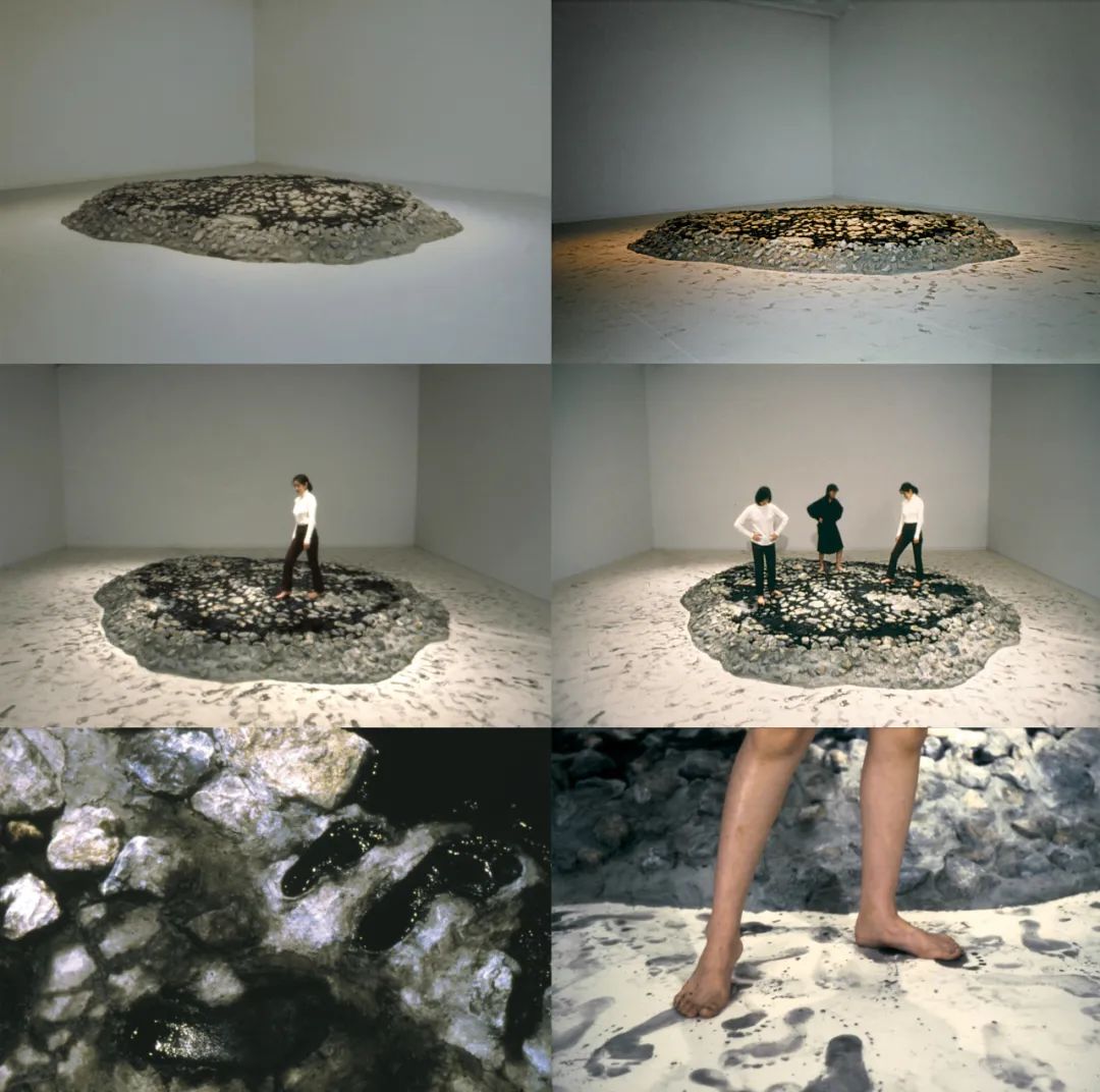 张健君:我肯定是生活在社会中,我也一日三餐。但是这两者之间我觉得不矛盾,所以始终在我的作品中出现平衡的瞬间。就像我刚才说的,这是我的呼吸方式。我有形而上的作品“拓”系列:《拓太阳》、《拓星座》、《拓雨》……我也有介入社会的作品,或者把人的痕迹参与其中的作品:比方说97年在东京做的《足迹》,我做了一个装置——在展厅中做了一个石岛,岛的底层是空的,水和墨缓慢的通过岛循环下去,你走进展厅能闻到淡淡的墨的味道,也能听到流水声,岛的顶部凿了一圈我从世界各地找的男女老少的脚印。