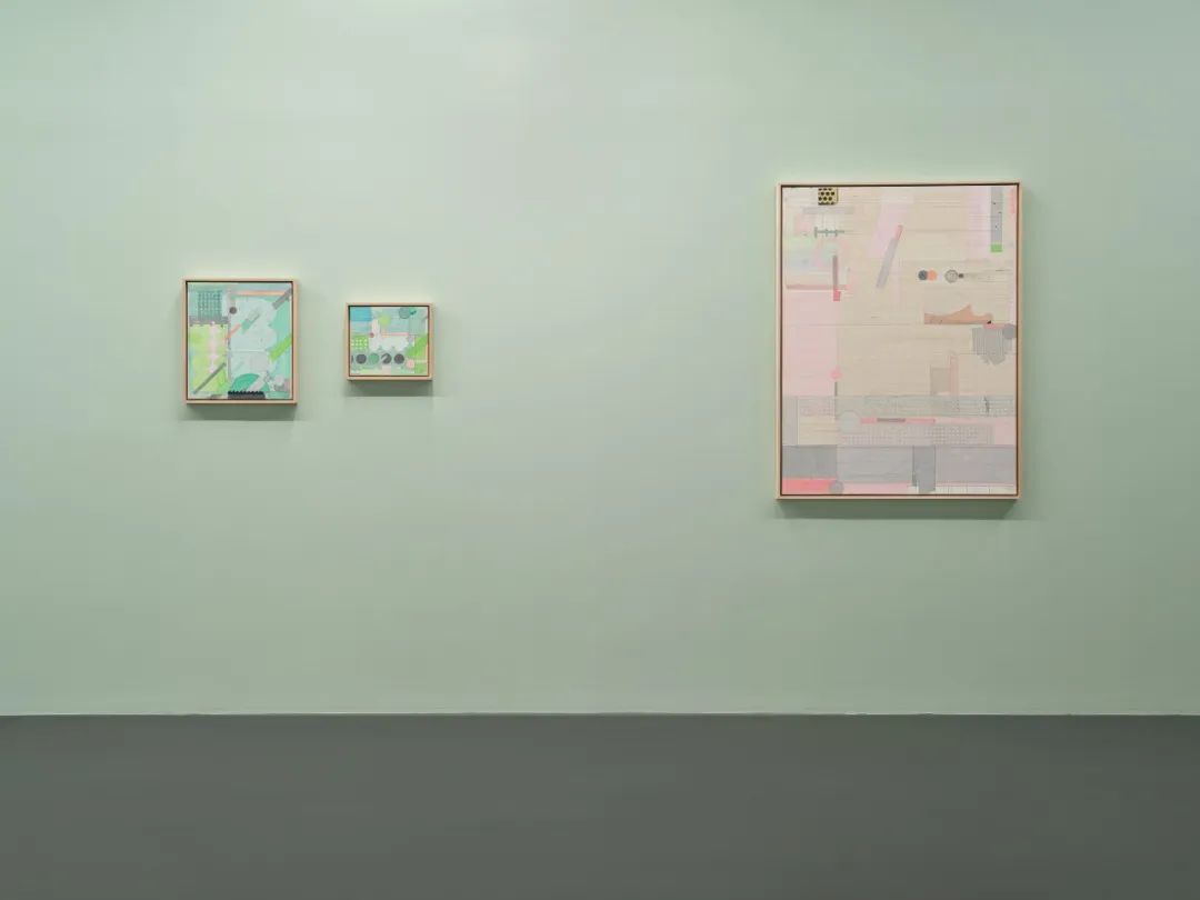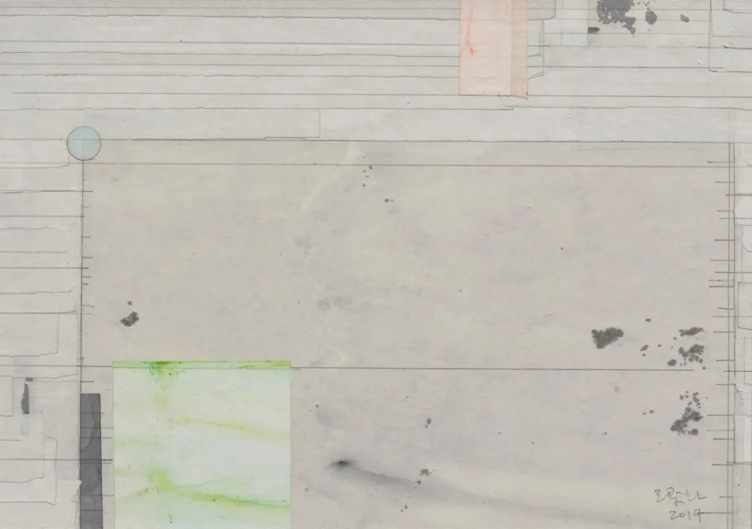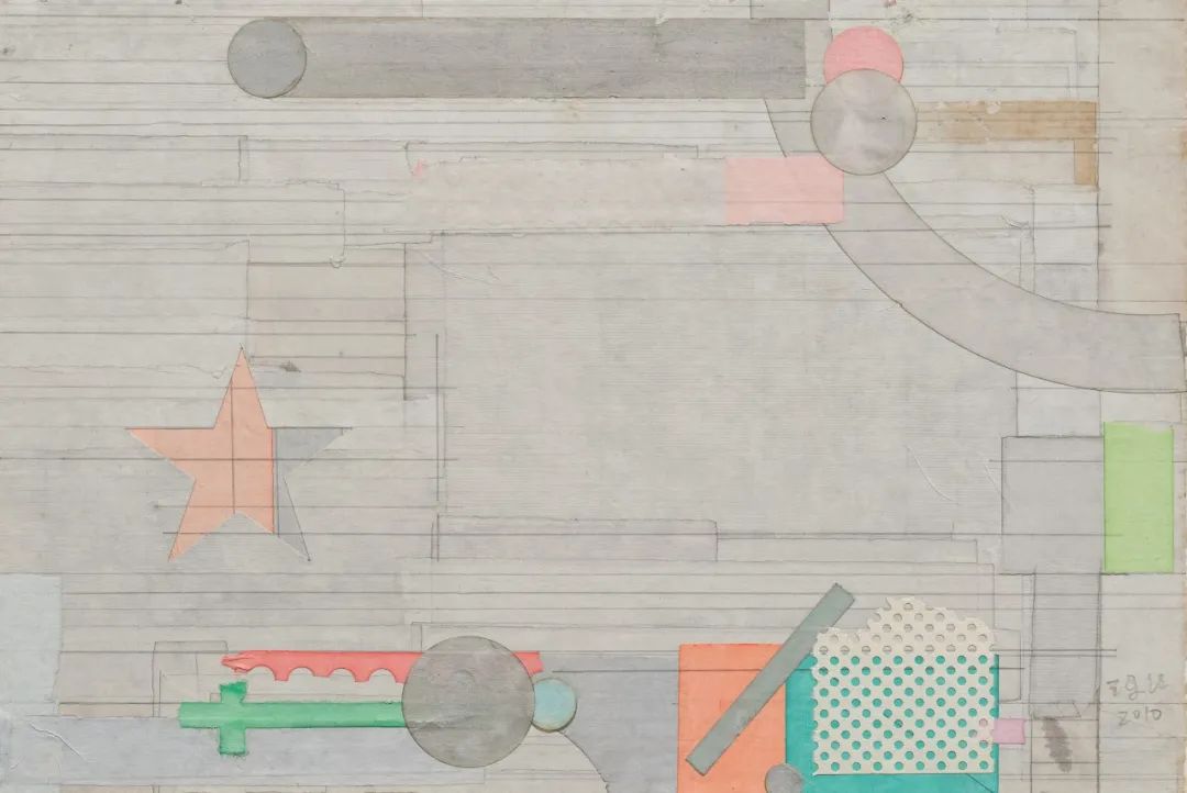 梁铨的许多拼贴画都展示了与国画留白相似的意趣。即一幅画的局部被故意留空,以在画面中创造空间。但对于细心的观众来说,看似空洞的东西,实则对细节和层次的精心处理。这就像一个捉迷藏的游戏,仔细观察,你会发现一个抽象艺术中最基础的元素——网格,正在悄然保证着作品的结构。巧心编排的画面怡然自得,不紧不慢,配上「柳浪闻莺」、「无所思」和「星夜旅程」等诗意的的标题,流露出恬淡之感。