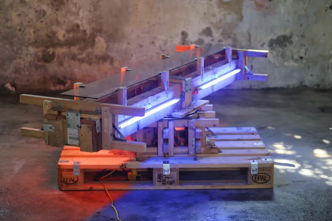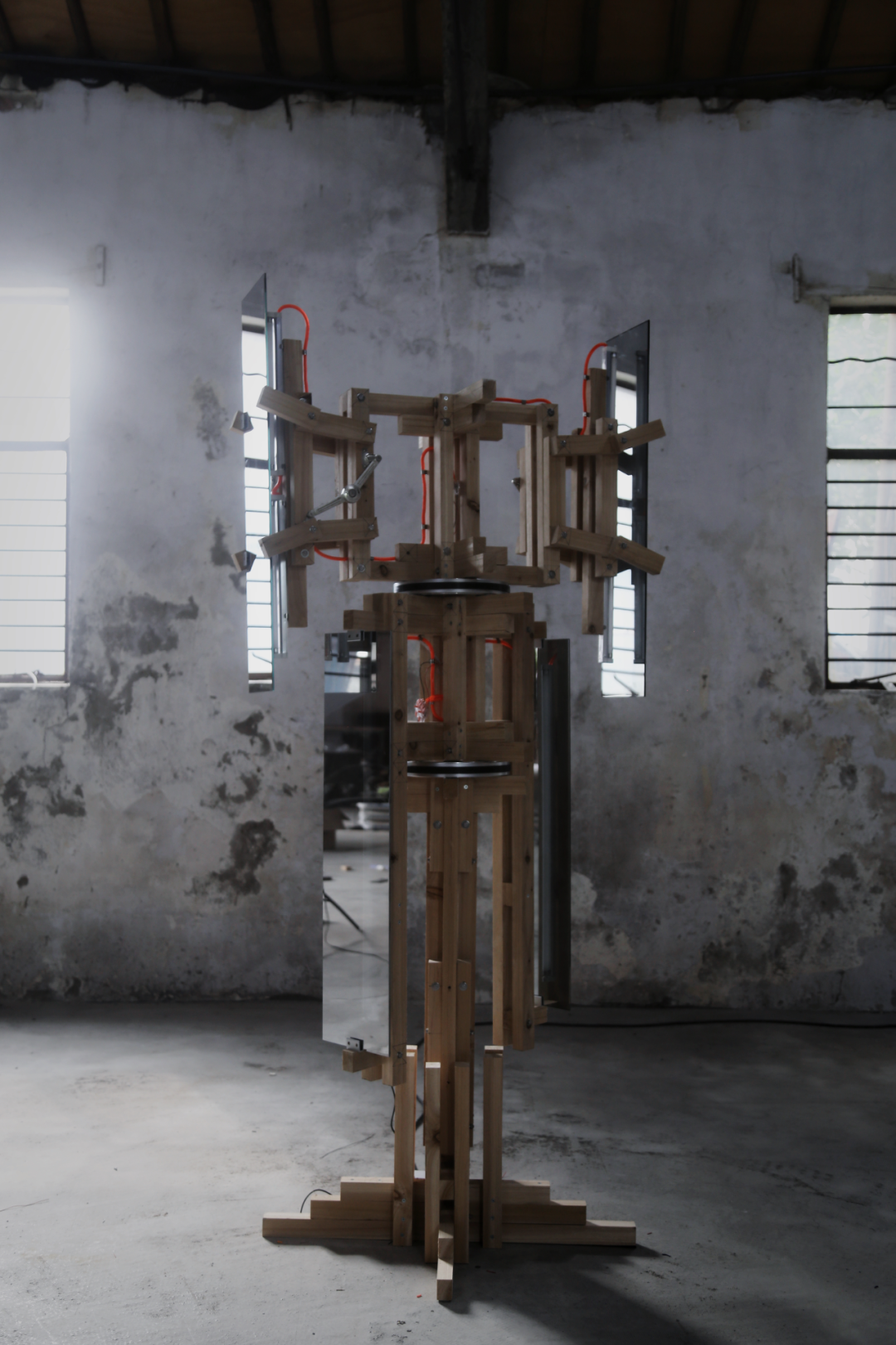 内窥像–02 ,综合材料动态雕塑⽊⻰⻣、物流托盘、单向镜、荧光灯、