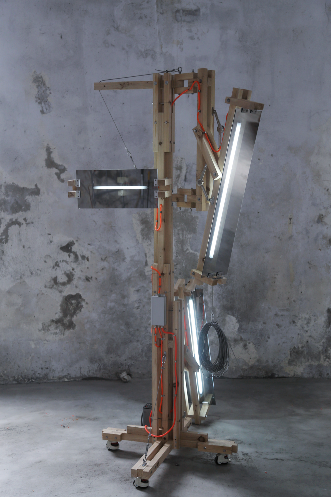 内窥像–04 ,综合材料动态雕塑⽊⻰⻣、物流箱、物流托盘、单向镜、荧光灯、转盘、电机、五⾦件,220 x 220 x 65 cm,2024