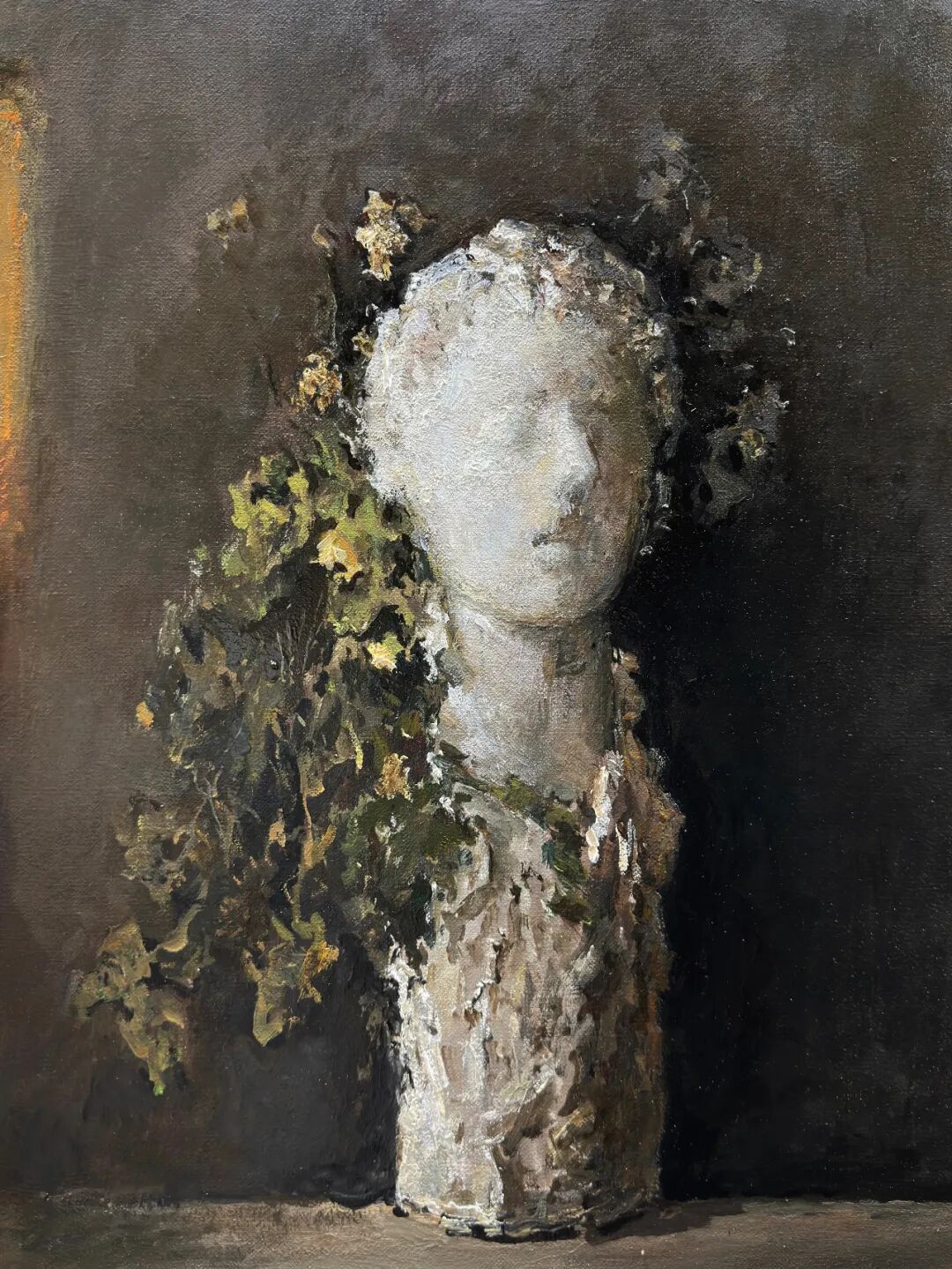 熵颜系列,创作进入 2025 年,我画面中开始频繁出现破损、衰败、残缺的视觉元素,有时是一尊风化剥落的雕塑人像,有时是一张斑驳破裂的“脸”。植物在有些画中仍然存在,但不再像先前那样蓬勃生长。取而代之的是造物的崩解,以及人类形象的消逝。直观地呈现出时间的侵蚀感:一切凝固的形态都在逐渐瓦解,显露出熵增加带来的毁坏之美。这是我在完成“石之生息”之后,继续深入思考的主题。