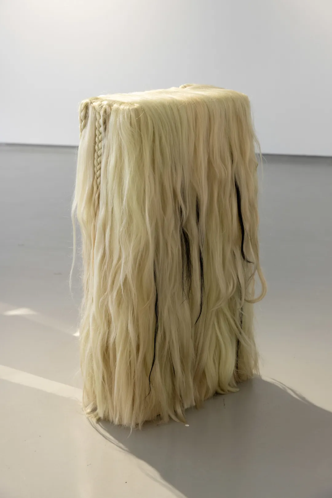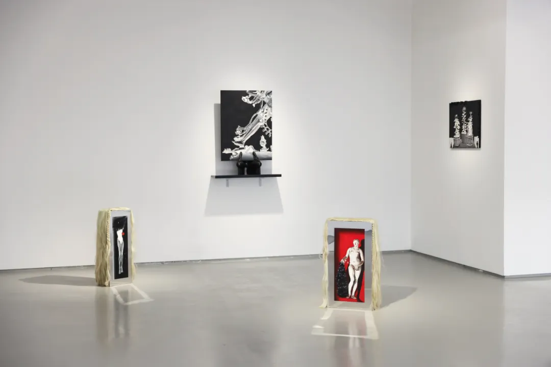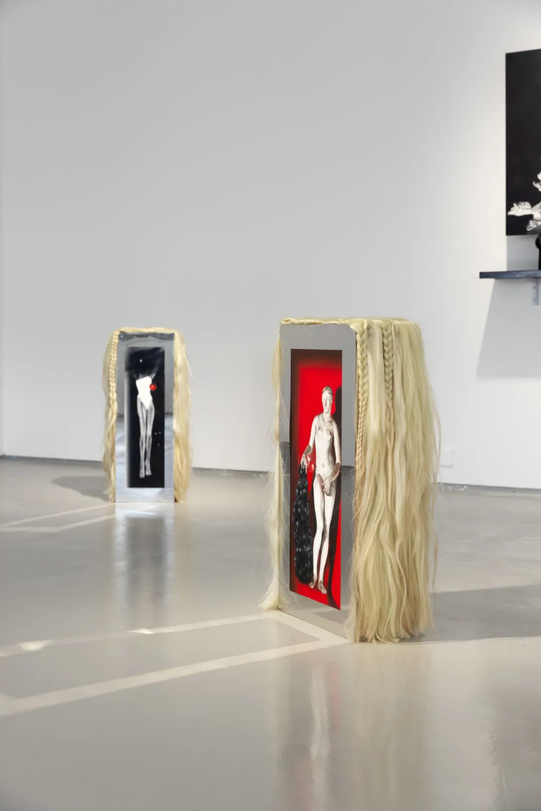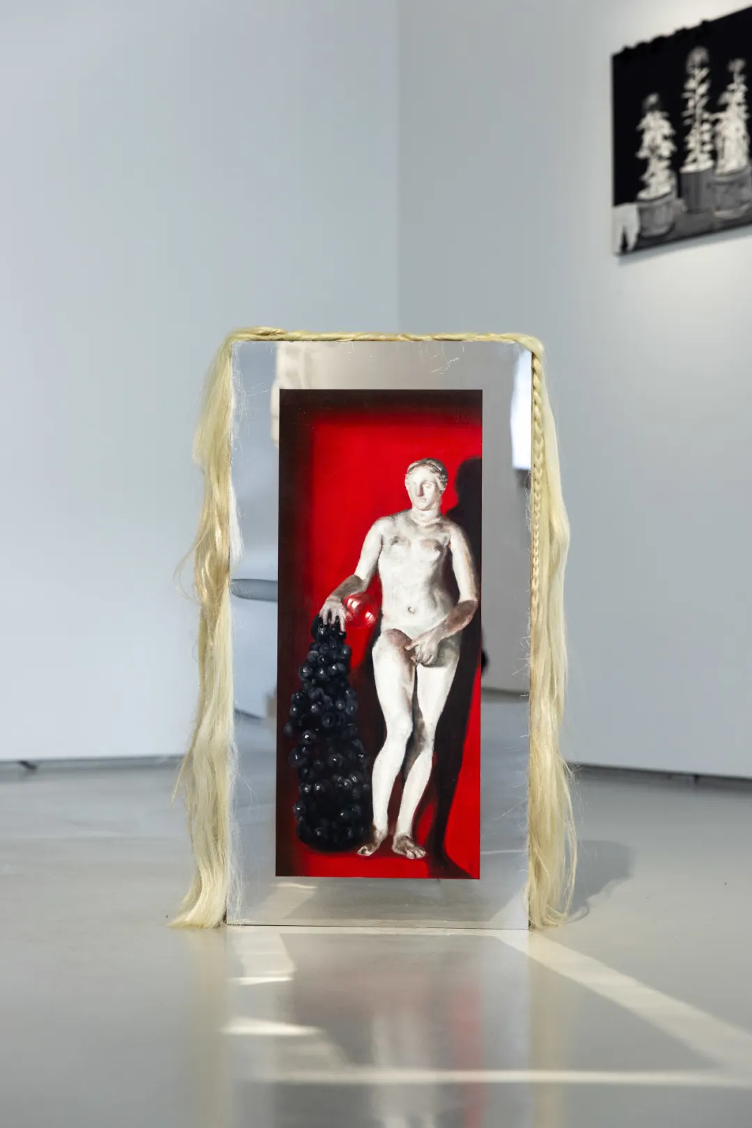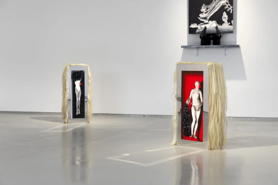 在林枞的创作逻辑中,图像首先被理解为一种“现成品”,它只指向图像自身,不指代任何超越性的意义。这一观念被延伸至媒介的选择:无论是镜面不锈钢还是假发,这些不同材料的地位与图像平行,它们并非被动承载画面的基底,而是同样作为“现成品”加入创作。这两件装置同样源于这一逻辑,并始于林枞的日常需求:电脑桌与茶几需要底座,装置便成为兼具实用功能的家具。在他的创作中“结合”和“生成”是最重要的两个主题,这种尝试也是他探索的一部分。