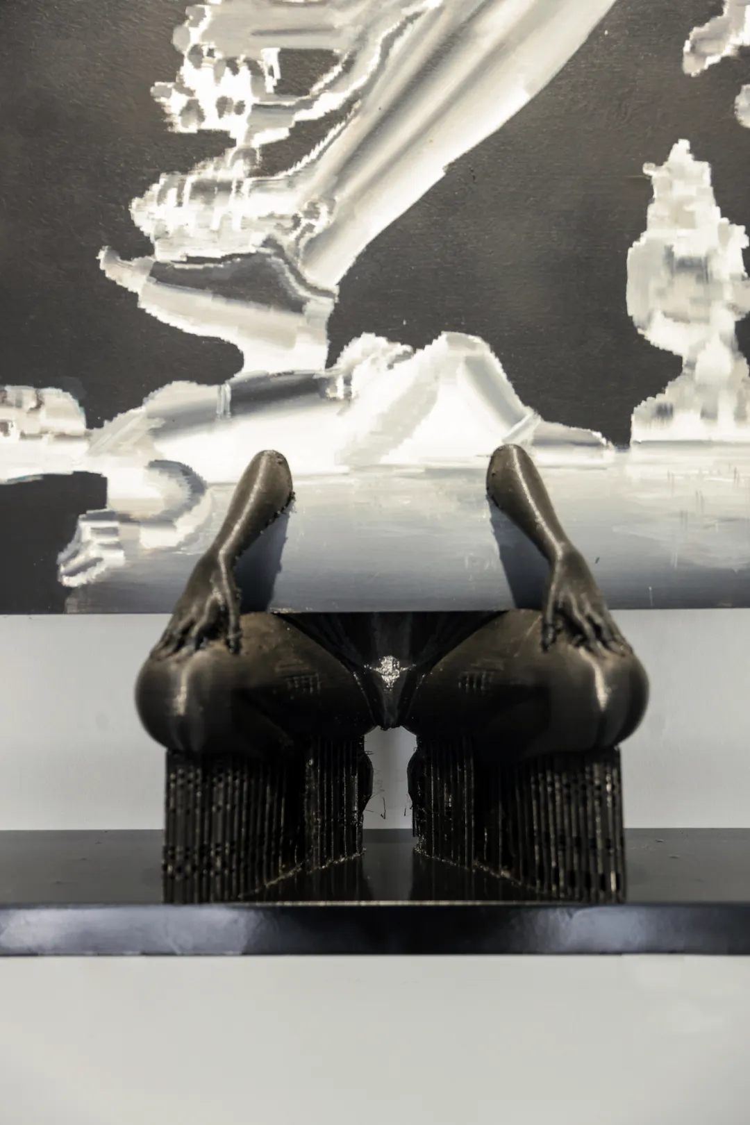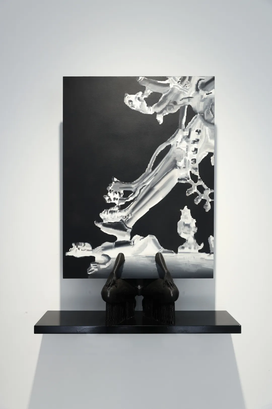 这系列作品呈现了一种类似早年网络图像多次传输后失真的锯齿感,这是内置于其创作逻辑中的“屏幕经验”。他将这种数字时代的视觉残影转译至绘画的物质表面。与此同时,3D打印在他的实践中不仅是制作手段,其产物亦成为作品不可分割的构件,既是底座,也是配件,与画面形成整体结构。
