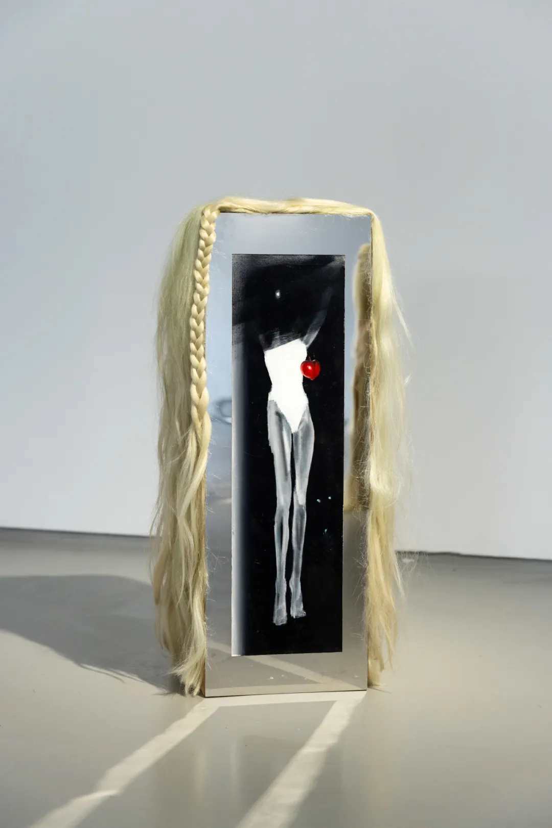Oil on marine plywood, stainless steel mirror, wig